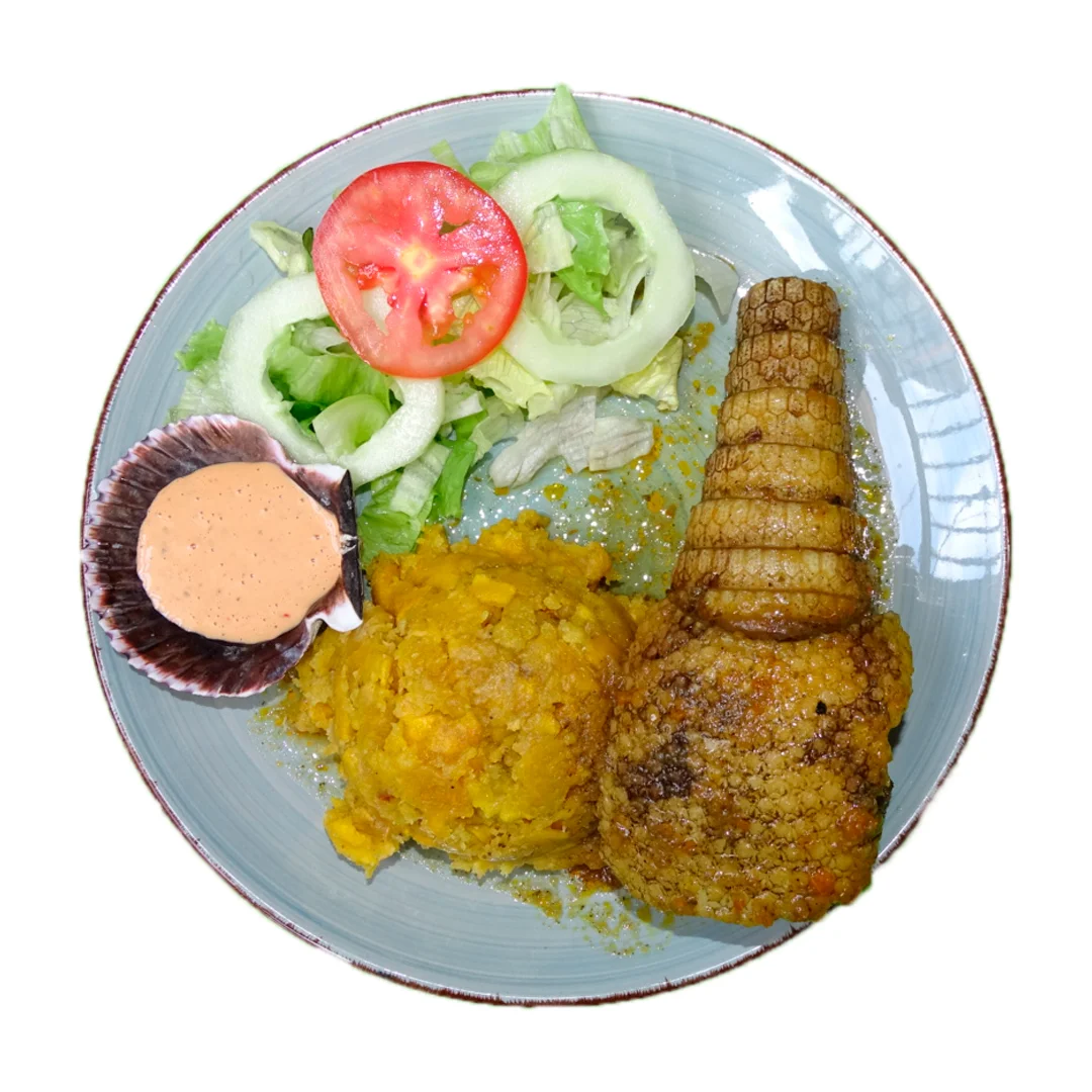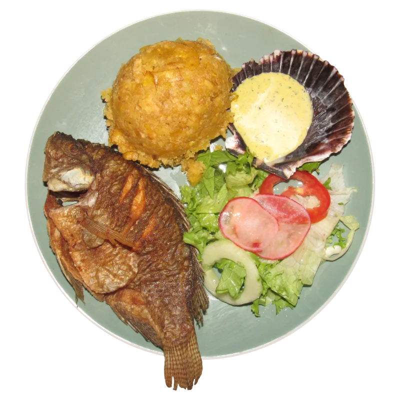 Filete de pescado aderazado en limón, sal y ajo acompañado de yuca dorada tacacho o patacones.