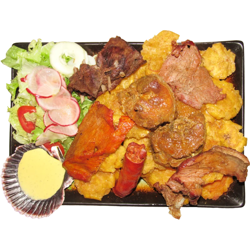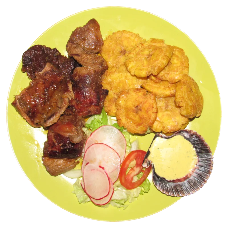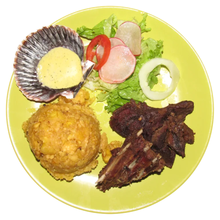 Costilla de cerdo ahumada a la parrilla acompañada de tacacho o patacones.