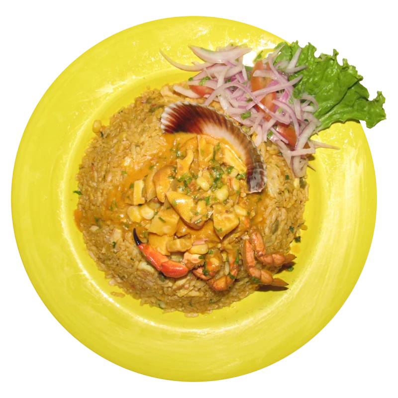 (A la hoja) (Sudado) (Al vapor) (Chilcano) (Frito), arroz acompañado de tacacho o patacones.