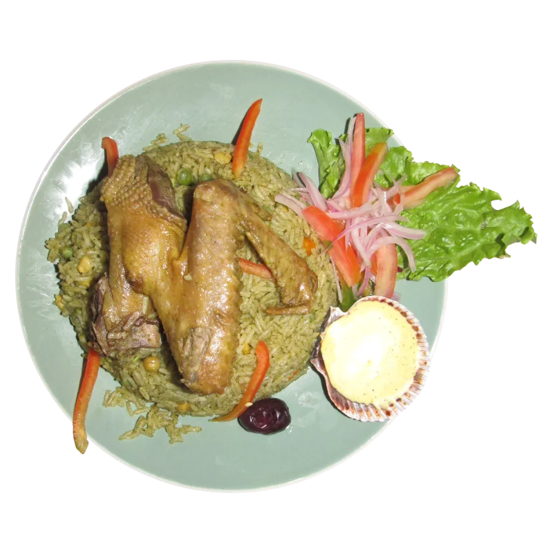 Arroz verde(culantro, espinaca, alberja, loche), pato maserado en chicha de jora.