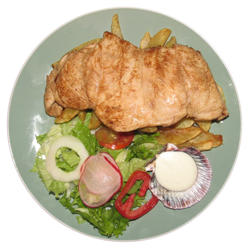 Pechuga de pollo aderazado en limón, sal y ajo acompañada de papas fritas y ensalada fresca.